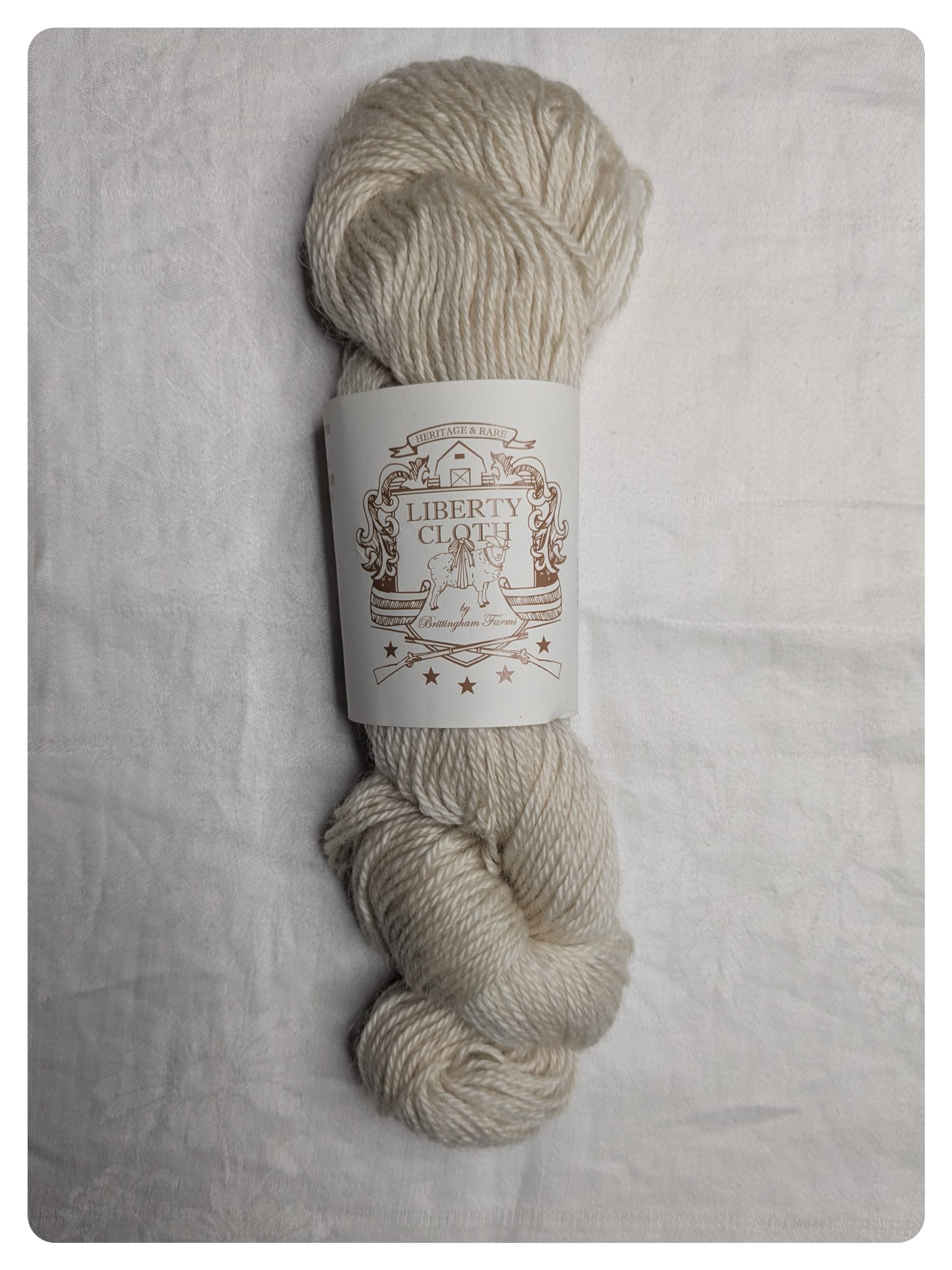 Yarn: Brittingham Liberty Cloth, undyed worsted, 100 percent wool from Leicester longwool sheep. Raised and shorn in Delaware, unclear where spun.